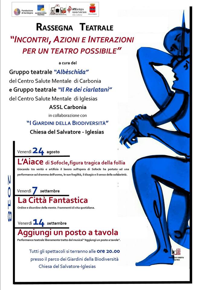 Dal 24 agosto fino al 14 settembre 2018 spazio alla rassegna teatrale curata dal gruppo teatro 'Associazione Albeschida' del Centro Salute Mentale di Carbonia e dal gruppo teatro 'Il re dei Ciarlatani' del Centro Salute Mentale di Iglesias, nel suggestivo parco de 'I Giardini della Biodiversità'